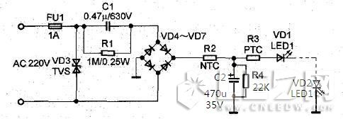 由于電容降壓電源是一種非隔離式電源,在通電瞬間會(huì)產(chǎn)生很大的電流,也就是所謂的浪涌電流。此外,由于外界環(huán)境的影響(如雷擊) 電網(wǎng)系統(tǒng)會(huì)侵入各種浪涌信號(hào),有些浪涌會(huì)導(dǎo)致LED的損壞。所以,要提供熱敏電阻保護(hù),這個(gè)主要有負(fù)溫度系數(shù)熱敏電阻保護(hù)(NTC熱敏電阻,NTC是Negative Temperature Coefficient的縮寫)和正溫度系數(shù)熱敏電阻保護(hù)(PTC(Positive Temperature Coefficient))然后有瞬態(tài)電壓抑制器保護(hù)((Transient Voltage Suppressor),簡稱TVS)