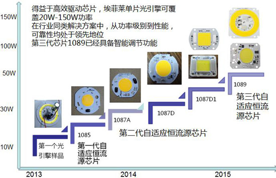 這種智能型LED凈化燈恒流源徹底打破了教科書里描述的線性恒流源效率很低的常規(guī)認(rèn)識,而破天荒地實(shí)現(xiàn)了99%的效率。從而可以實(shí)現(xiàn)把恒流源和光源放在同一塊鋁基板上,而做成光電一體化的光引擎。因?yàn)樗旧淼墓臉O低,所以把它放到光源的鋁基板上不會增加LED的結(jié)溫。深圳埃菲萊公司采用這種智能型恒流源已經(jīng)生產(chǎn)了一系列不同功率的光引擎: