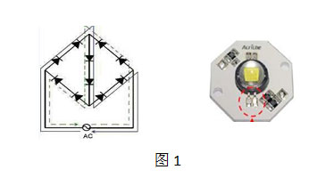 AC LED可分為兩類:一類是由單芯片封裝,芯片上多有個LED單元串聯(lián),并利用部分LED單元組成整流路,實現(xiàn)交流發(fā)光。參見圖一。