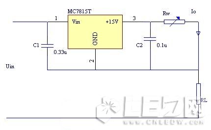 恒流輸出電路是采用集成穩(wěn)壓器構成的開關恒流源電路構成如下圖所示。MC7815為三端固定式集成穩(wěn)壓器,RL為LED二極管負載電阻,RW為可調(diào)電阻器。