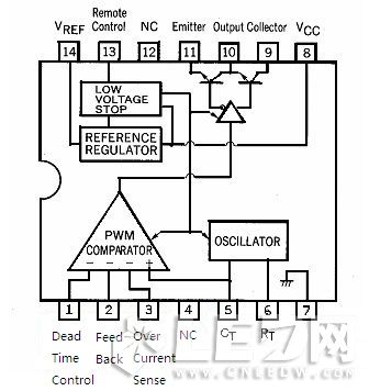 振蕩器的振蕩頻率fosc有接在引腳6上的定時電阻器R17與接在引腳5上的定時電容器C15決定的。當 時振蕩頻率 。