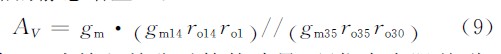 從圖4可以看到,電路為單級折疊式共源共柵結(jié)構(gòu),這種結(jié)構(gòu)有很高的輸出電阻,保證了電路的高電壓增益。結(jié)合模擬集成電路的基本知識,可得到電路的靜態(tài)增益: