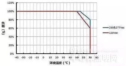 藍(lán)色曲線則表示 LED凈化燈 驅(qū)動(dòng)器在輸入 230Vac 或 277Vac 情況下,其負(fù)載隨環(huán)境溫度變化的功率降額曲線,其原理類(lèi)同。