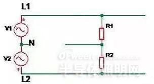 如上圖所示,V1 表示第一相電壓,V2表示第二相電壓,R1 及 R2 分別表示正常安裝到線路中的 LED 驅(qū)動(dòng)器。當(dāng)線路上零線(N)如圖斷開(kāi)時(shí),兩個(gè)支路上的驅(qū)動(dòng)器 R1,R2 相當(dāng)于串聯(lián)后接到 380Vac 電壓上。因?yàn)檩斎雰?nèi)阻差異,當(dāng)其中一個(gè)驅(qū)動(dòng)器充電到啟動(dòng)時(shí),內(nèi)阻變小,電壓可能大部分加到另外一個(gè)驅(qū)動(dòng)器上,導(dǎo)致其過(guò)壓損壞失效。