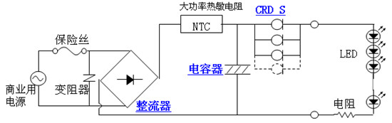 圖中的CRD就是恒流二極管,圖上采用了幾個CRD并聯(lián),以得到所需的恒流值,實(shí)際上現(xiàn)在有很多不同恒流值的恒流二極管可供選用,所以也不需要采用并聯(lián)的方法來得到所需的恒流值了。所以只要采用一個恒流值相當(dāng)?shù)暮懔鞫O管和所有LED凈化燈相串聯(lián)就可以實(shí)現(xiàn)對LED的恒流供電,可見它的電路是十分簡單的!