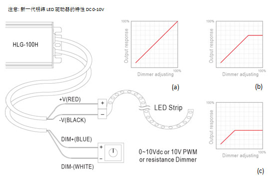 圖1: 明緯LED驅(qū)動(dòng)器 HLG-100于不同負(fù)載(長度)狀況聯(lián)接于LED燈條: (a)滿載100%--可產(chǎn)生最好的調(diào)光表現(xiàn);(b)負(fù)載70%--則顯示了不完美調(diào)光效果;(c)負(fù)載30%-- 顯示出較差的調(diào)光結(jié)果,因?yàn)榭烧{(diào)光范圍太窄。