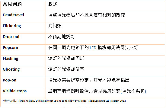 調(diào)光聽起來似乎是件簡單的事,事實(shí)上想要有良好并順暢的調(diào)光表現(xiàn)是需要考慮很多要素,常見的LED調(diào)光不良的情況有很多,如下表(一)所示: