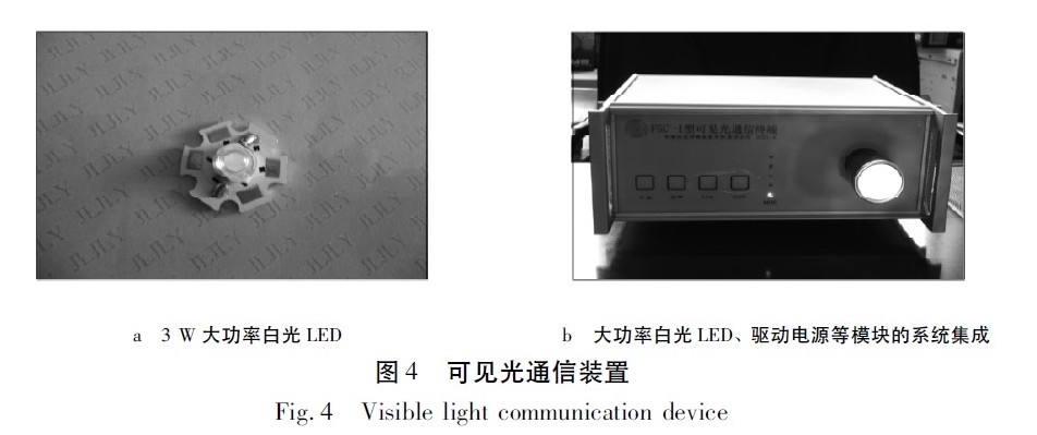 為測試所制作的雙DC /DC 并聯(lián)供電系統(tǒng)的性能,采用3 W 大功率白光LED( 額定電流750 mA、額定電壓4. 0 V) 做了驅(qū)動實(shí)驗(yàn)與性能測試,LED 的照片如圖4 所示。將大功率白光并聯(lián)供電系統(tǒng)、大功率白光LED、數(shù)據(jù)編碼模塊、Bias-Tee 耦合模塊以及按鍵/指示燈等進(jìn)行了系統(tǒng)集成,研制了兼具照明與通信雙重功能的通信裝置( 見圖4b) .利用該裝置,對給出的并聯(lián)供電系統(tǒng)進(jìn)行了實(shí)驗(yàn)。